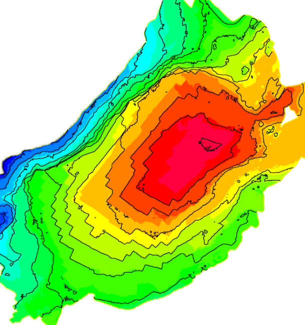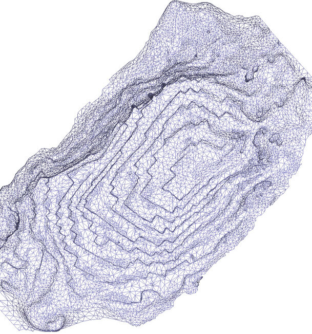 Απεικόνιση ψηφιακού μοντέλου εδάφους με ισοϋψείς, με χρωματική διαβάθμιση ανάλογα με το υψόμετρο και δίκτυο τριγώνων.